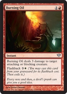 Burning Oil deals 3 damage to target attacking or blocking creature. Flashback 3W (You may cast this card from your graveyard for its flashback cost. Then exile it.)