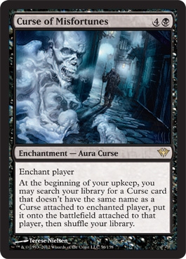 Enchant player At the beginning of your upkeep, you may search your library for a Curse card that doesn't have the same name as a Curse attached to enchanted player, put it onto the battlefield attached to that player, then shuffle your library.