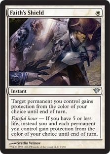Target permanent you control gains protection from the color of your choice until end of turn. Fateful hour - If you have 5 or less life, instead you and each permanent you control gain protection from the color of your choice until end of turn.