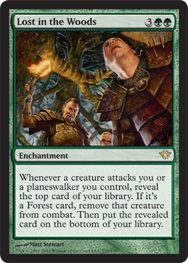 Whenever a creature attacks you or a planeswalker you control, reveal the top card of your library. If it's a Forest card, remove that creature from combat. Then put the revealed card on the bottom of your library.