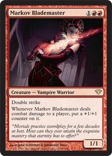 Double strike Whenever Markov Blademaster deals combat damage to a player, put a +1/+1 counter on it.