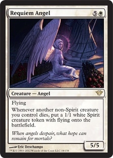Flying Whenever another non-Spirit creature you control dies, put a 1/1 white Spirit creature token with flying onto the battlefield.