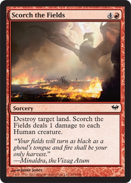 Destroy target land. Scorch the Fields deals 1 damage to each Human creature.