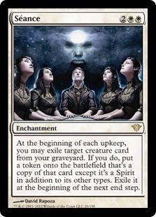 At the beginning of each upkeep, you may exile target creature card from your graveyard. If you do, put a token onto the battlefield that's a copy of that card except it's a Spirit in addition to its other types. Exile it at the beginning of the next end step.