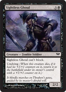 Sightless Ghoul can't block. Undying (When this creature dies, if it had no +1/+1 counters on it, return it to the battlefield under its owner's control with a +1/+1 counter on it.)