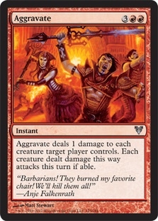 Aggravate deals 1 damage to each creature target player controls. Each creature dealt damage this way attacks this turn if able.