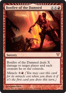 Bonfire of the Damned deals X damage to target player and each creature he or she controls. Miracle XR (You may cast this card for its miracle cost when you draw it if it's the first card you drew this turn.)