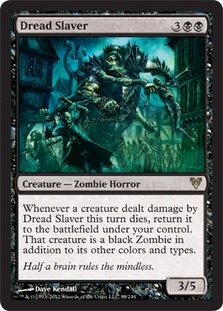 Whenever a creature dealt damage by Dread Slaver this turn dies, return it to the battlefield under your control. That creature is a black Zombie in addition to its other colors and types.