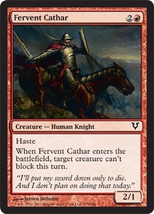Haste When Fervent Cathar enters the battlefield, target creature can't block this turn.