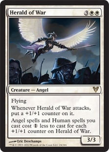 Flying Whenever Herald of War attacks, put a +1/+1 counter on it. Angel spells and Human spells you cast cost 1 less to cast for each +1/+1 counter on Herald of War.