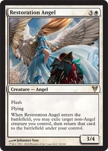 Flash Flying When Restoration Angel enters the battlefield, you may exile target non-Angel creature you control, then return that card to the battlefield under your control.