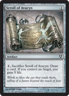 1, Sacrifice Scroll of Avacyn: Draw a card. If you control an Angel, you gain 5 life.