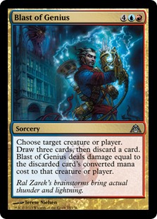 Choose target creature or player. Draw three cards, then discard a card. Blast of Genius deals damage equal to the discarded card's converted mana cost to that creature or player.