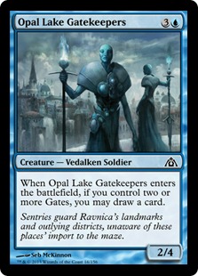 When Opal Lake Gatekeepers enters the battlefield, if you control two or more Gates, you may draw a card.