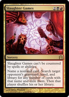 Name a nonland card. Search target opponent's graveyard, hand, and library for any number of cards with that name and exile them. Then that player shuffles his or her library.