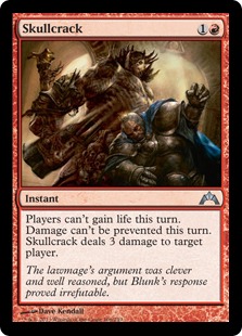 Players can't gain life this turn. Damage can't be prevented this turn. Skullcrack deals 3 damage to target player.