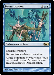 At the beginning of your end step, if enchanted creature's power is 4 or greater, sacrifice Domestication.