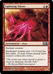 Enchanted creature gets +3/+0 and has first strike. (It deals combat damage before creatures without first strike.)