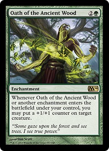 Whenever Oath of the Ancient Wood or another enchantment enters the battlefield under your control, you may put a +1/+1 counter on target creature.