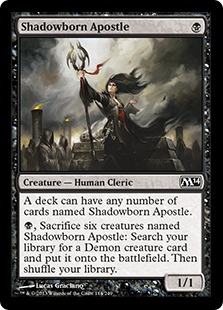 {B}, Sacrifice six creatures named Shadowborn Apostle: Search your library for a Demon creature card and put it onto the battlefield. Then shuffle your library.