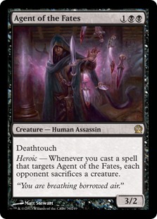 Heroic — Whenever you cast a spell that targets Agent of the Fates, each opponent sacrifices a creature.