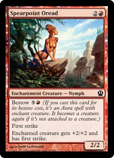 Bestow {5}{R} (If you cast this card for its bestow cost, it's an Aura spell with enchant creature. It becomes a creature again if it's not attached to a creature.)