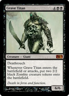 Whenever Grave Titan enters the battlefield or attacks, put two 2/2 black Zombie creature tokens onto the battlefield.