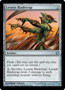 {2}, Sacrifice Leonin Bladetrap: Leonin Bladetrap deals 2 damage to each attacking creature without flying.