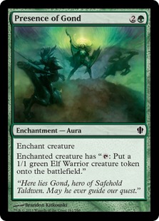 Enchanted creature has "{T}: Put a 1/1 green Elf Warrior creature token onto the battlefield."