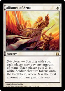 Join forces — Starting with you, each player may pay any amount of mana. Each player puts X 1/1 white Soldier creature tokens onto the battlefield, where X is the total amount of mana paid this way.