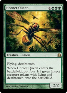 When Hornet Queen enters the battlefield, put four 1/1 green Insect creature tokens with flying and deathtouch onto the battlefield.
