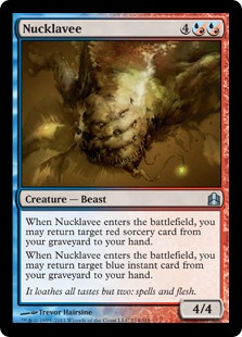 When Nucklavee enters the battlefield, you may return target red sorcery card from your graveyard to your hand.