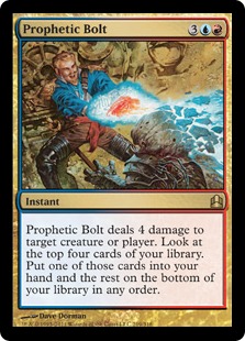 Prophetic Bolt deals 4 damage to target creature or player. Look at the top four cards of your library. Put one of those cards into your hand and the rest on the bottom of your library in any order.