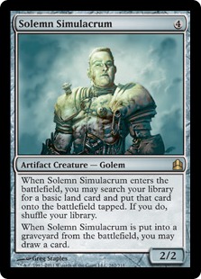 When Solemn Simulacrum enters the battlefield, you may search your library for a basic land card, put that card onto the battlefield tapped, then shuffle your library.