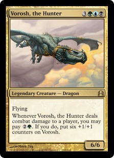 Whenever Vorosh, the Hunter deals combat damage to a player, you may pay {2}{G}. If you do, put six +1/+1 counters on Vorosh.