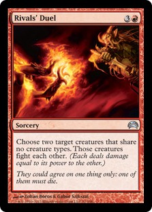 Choose two target creatures that share no creature types. Those creatures fight each other. (Each deals damage equal to its power to the other.)
