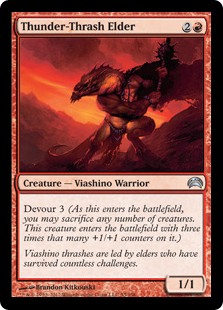 Devour 3 (As this enters the battlefield, you may sacrifice any number of creatures. This creature enters the battlefield with three times that many +1/+1 counters on it.)