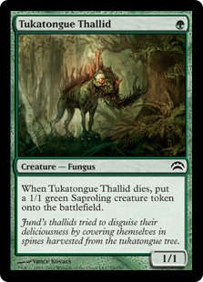 When Tukatongue Thallid dies, put a 1/1 green Saproling creature token onto the battlefield.