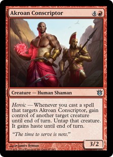 Heroic — Whenever you cast a spell that targets Akroan Conscriptor, gain control of another target creature until end of turn. Untap that creature. It gains haste until end of turn.