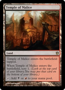 When Temple of Malice enters the battlefield, scry 1. (Look at the top card of your library. You may put that card on the bottom of your library.)