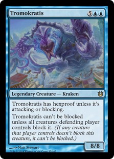 Tromokratis can't be blocked unless all creatures defending player controls block it. (If any creature that player controls doesn't block this creature, it can't be blocked.)