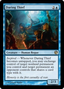 Inspired — Whenever Daring Thief becomes untapped, you may exchange control of target nonland permanent you control and target permanent an opponent controls that shares a card type with it.
