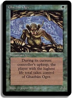 During its current controller's upkeep, the player with the highest life total takes control of Ghazban Ogre.