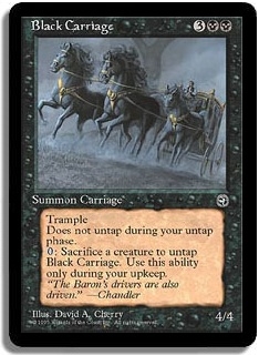 Trample. Does not untap during your untap phase. <0>: Sacrifice a creature to untap Black Carriage. Use this ability only during your upkeep.