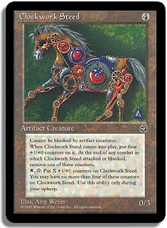 Cannot be blocked by artifact creatures. When Clockwork Steed comes into play, put four +1/+0 counters on it. At the end of any combat in which Clockwork Steed attacked or blocked, remove one of these counters. <X,T>: Put X +1/+0 counters on Clockwork Steed. You may have no more than four of these counters on Clockwork Steed. Use this ability only during your upkeep.