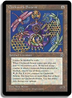Cannot be blocked by walls. When Clockwork Swarm comes into play, put four +1/+0 counters on it. At the end of any combat in which Clockwork Swarm attacked or blocked, remove one of these counters. <X,T>: Put X +1/+0 counters on Clockwork Swarm. You may have no more than four of these counters on Clockwork Swarm. Use this ability only during your upkeep.