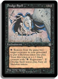 <B>: Remove from the game 2 target creatures from your graveyard to put a skeleton token into play. Treat this token as a 1/1 black creature with '<B>: Regenerate'. If Drudge Spell leaves play, bury all Skeleton tokens.