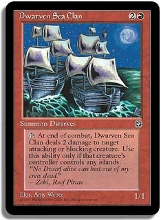 <T>: At the end of combat, Dwarven Sea Clan deals 2 damage to target attacking or blocking creature. Use this ability only if that creature's controller controls any islands.