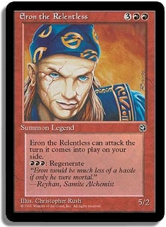 Eron the Relentless can attack the turn it comes into play on your side. <RRR>: regenerate.