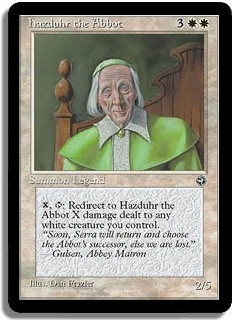 <X,T>: Redirect to Hazduhr the Abbot X damage dealt to any white creature you control.